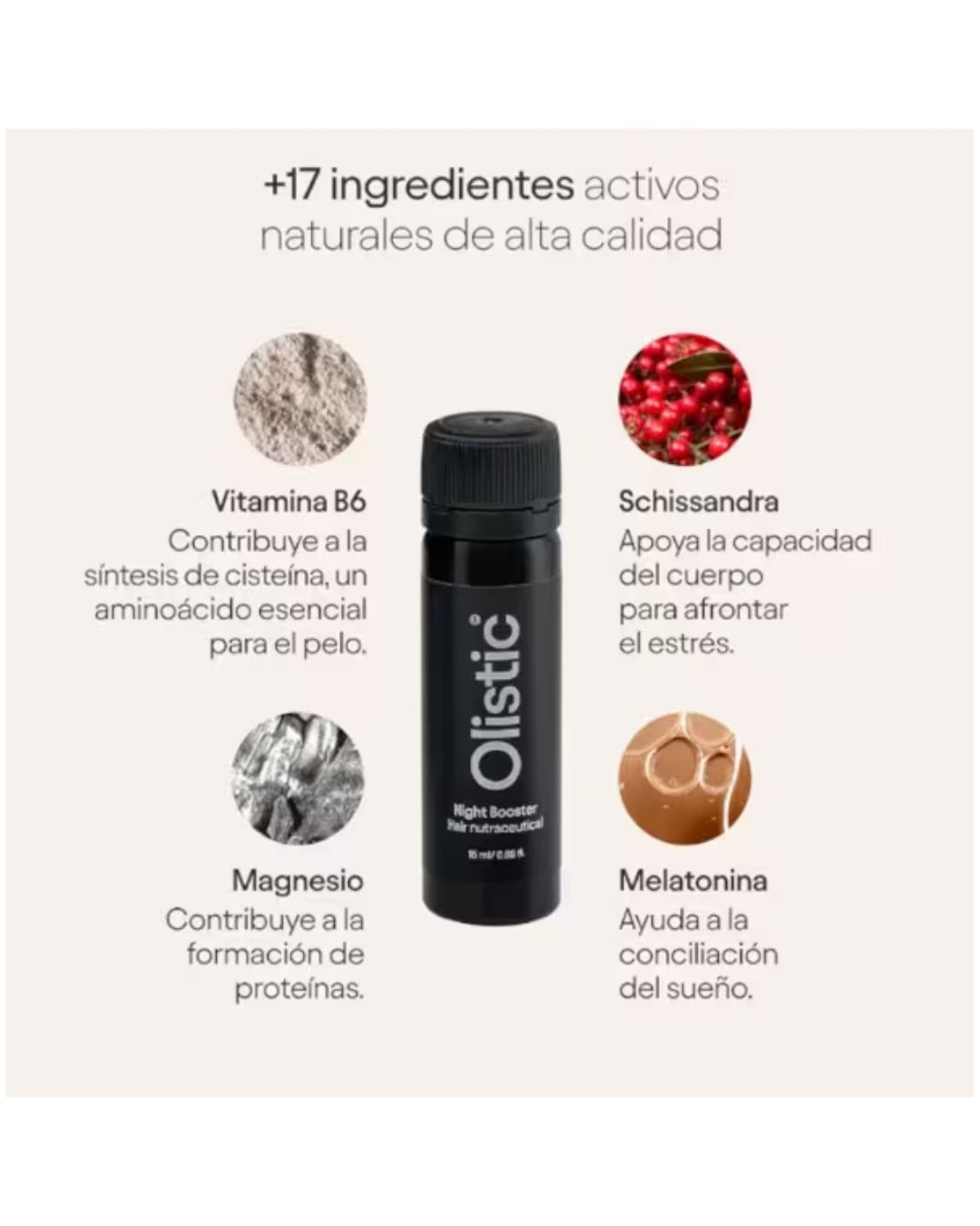 Olistic Night Booster es un complemento alimenticio bebible diseñado para potenciar la regeneración celular y la detoxificación nocturna, ayudando a que tu cabello crezca más fuerte, denso y saludable.
